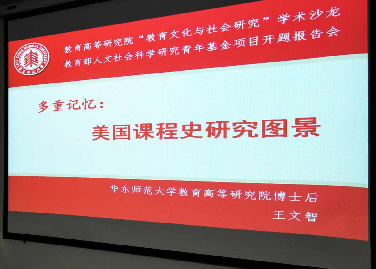 2015年12月9日下午,教育高等研究院第13期“教育文化与社会研究”学术沙龙,在中山北路校区理科大楼举行。华东师范大学教育高等研究院博士后研究人员王文智以“多重记忆:美国课程史研究图景”为题与参与沙龙的老师和同学们分享了他对美国课程史研究的理解。沙龙由教育高等研究院胡乐野老师主持,教育高等研究院副院长周勇教授、教育高等研究院兼职教授李梅博士,以及来自教育系和课程系多个专业的老师和同学也参加了本次沙龙。