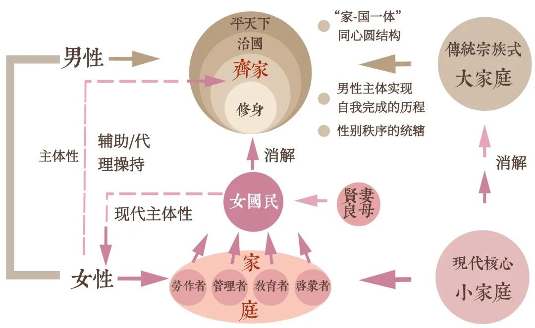 晚清以降,国势衰颓之气象与救国图存之殷切,始终萦系于知识分子之襟怀。家国一体的精神内核仍然不断变幻着其表象而承续于追索富国强民的思想途径中,成为二十世纪初有识先声者构建其政治理想时大举援用的思想资源。清末立足国运以审视与昌发家政教育,近现代意义家政教育随之蹒跚起步。《新撰家政学》有序言曰:“积人成家,积家成国。家之成也,立国之本也,此家齐而后国治之说也。”[11]在曾纪芬重编下田氏家政学时亦在序言中强调:“国脉之隆盛,基乎家庭;而家道之振兴,关乎教育。”[12]同时,在“修齐治平”与“由家而国”的图式中,女性通过遵从性别秩序与履行家庭内务,间接承担着构建“家国一体”阶序格局之职责。(如图)