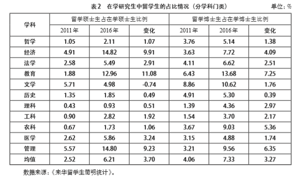 留学生比重是学科国际化水平的重要体现。2011年,教育学门类在学硕士生中国际学生的比重仅为1.88%,在学博士生中国际学生的比重仅为6.43% ;到2016年,在学硕士生和博士生中国际学生的比重分别提高至12.96%和13.68%,增幅在各学科门类中居于首位,这表明我国教育学的国际化水平提升显著。和在学研究生中留学生占比的平均水平比较后发现,2016年教育学门类在学研究生中留学生占比约为平均水平的两倍,这表明中国教育学门类对国际学生具有较大的吸引力,教育学已成为一门有担当的学科(见表2)。