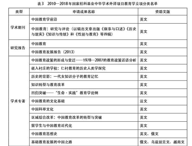 国家社科基金于2010年开始设立中华学术外译项目,该项目主要立足于学术层面,通过资助我国哲学社会科学优秀成果以外文形式在国外知名出版机构出版,进入国外主流发行传播渠道,从而增进国外对当代中国以及中国传统文化的了解,推动中外学术交流与对话,提高中国哲学社会科学的国际影响力。项目自2016年开始改为每年一次集中受理申报评审。在2010年立项之初,教育学并未列居其中。而从2010年至2018年批准立项的整体情况来看,在全部846个项目中,教育学共有23项,仅占总数的2.7%(见表3)。由此可见,当前我国教育学科的学术外译项目相对不足,推动教育学研究向外传播的支持力度亟待加强。