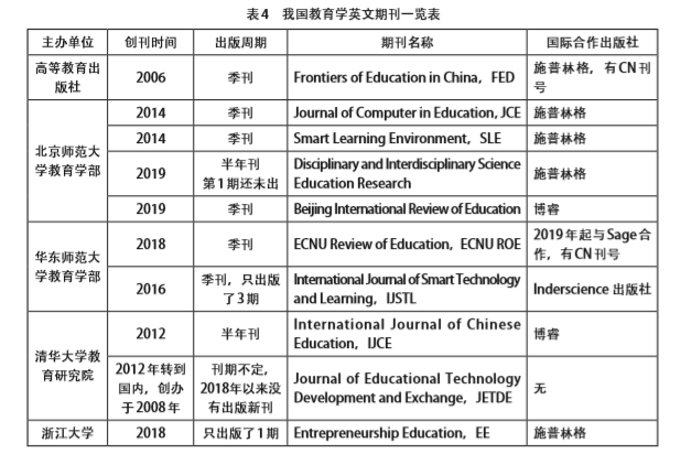 21 世纪初以来,英文期刊建设已经成为我国教育学科发展的重要组成部分。自2006 年起,我国陆续创办了10种英文期刊(见表4),期刊累计出版72期,论文近550篇,作者1008位,国际作者比例平均超过65%,编辑团队国际化平均比例近50%,全球WebofScience引用超过500次。其中,7种期刊分别与施普林格-自然(Springer)出版集团及博睿(Brill)出版社合作,办刊起点较高。然而从长远发展来看,我们还需要进一步强化教育学英文期刊发展的质量要求,提升主编团队的国际影响力,淡化期刊的单位机构属性,加强同行评议,改变期刊的刊期不定等粗放发展方式,以保证我国教育学英文期刊的长效发展。