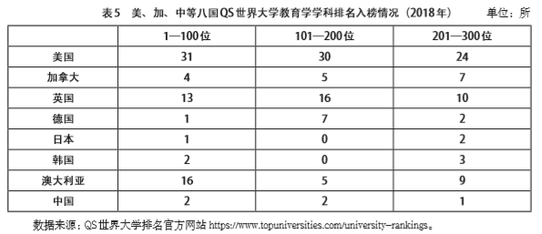 各类世界大学排名中的教育学排名是反映教育学学科质量的一个重要方面。尽管此类排名仍有诸多可商榷之处,但值得关注的是,近几年的世界大学排行里中国高校的教育学科开始崭露头角。如前所述,从QS排名来看,2019年北京师范大学排在第29位,北京大学位列51—100,华东师范大学位列101—150,清华大学位列151—200,浙江大学位列201—250(见表5);从泰晤士(THE)排名来看,在2019年的榜单中,中国有4所高校进入前400,分别为北京大学、浙江大学、华东师范大学和厦门大学,其中北京大学位列全球第26位(见表6)。