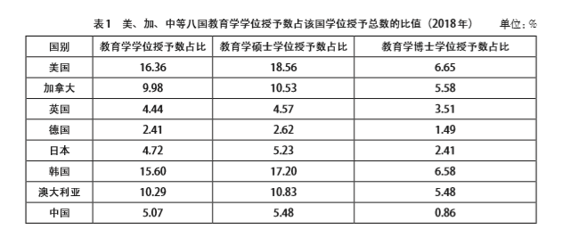 教育学的相对位置可由教育学一级学科学位授予数占学位授予总数的比例加以反映。该比例能够在一定程度上反映教育学科的学科地位。2011—2018 年,教育学博士学位授予数占全国博士学术学位授予总数的比例保持在1%左右,且呈现出下降趋势;教育学硕士学位授予数占全国硕士学术学位授予总数的比例基本稳定在2% 左右。相比之下,教育博士与教育硕士专业学位授予数占全国专业学位授予总数的比例相对较大,这表明教育专业学位研究生的发展现状相对较好。置于国际教育学科发展的背景下来审视,由于各国教育体制不一,特别是学位类型有很大的区别,这里尽可能以各国教育学科相近、可比的指标来表征中国(不含港澳台地区,全文同)教育学科与美、加、英、德、日、韩、澳七国教育学科在规模、结构和质量上的数据表现(如表1所示)。相比国外发达国家教育学科的规模体量,我国教育学科当前处于较低水平。即使是教育学学位授予的绝对数量,也不显著高于那些高等教育体系远小于我国的国家(德国、法国、日本和韩国等)。相较于国外教育学科在国家学科结构中所占的位置,我国教育学科也显著不如美国、加拿大、澳大利亚和韩国等国家。
