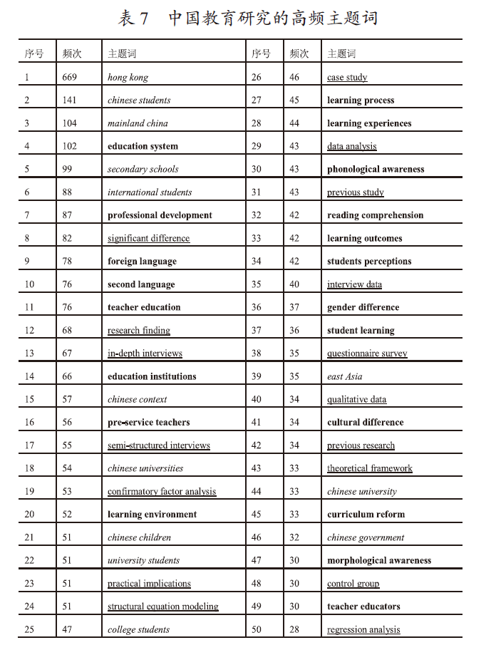 上表列出了频次靠前的50个主题词,我们可以将其分为三类。第一类是宏观的地域性、背景性名词,反映出国际中国教育研究的取样通常是中国香港、中国大陆以及东亚地区的学校或学生群体。第二类是研究方法和学术写作术语如significant difference、in-depth interviews、previous study等(表中下划线标记)。可见,中国教育研究在研究方法上涵盖了多种质性研究和量化研究;第三类则是体现研究主题的词语,如professional development、second language、learning environment等(表中加粗字)。可以看出,中国教育研究的核心议题集中在教师教育、学习心理、语言学习、课程改革、教育政策研究这几方面。