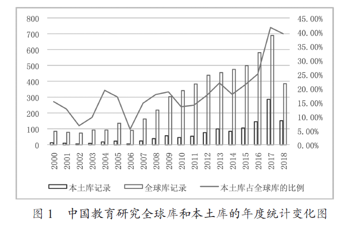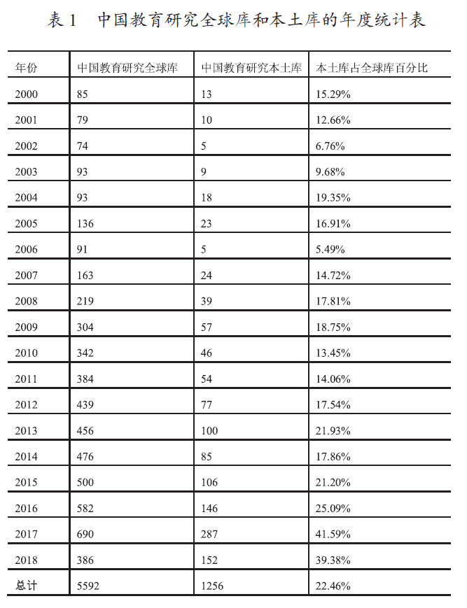 本研究选取WOS中的EDUCATION EDUCATIONAL RESEARCH和EDUCATION SPECIAL这两大类的教育研究进行分析。数据库检索分为两步,首先将主题词限定为“中国”,包括“中国”(China、Chinese)及中国的代称(sino*),全国所有的省、省会名称以及一些代表中国教育的特定词汇如“书院”(shuyuan)、“儒家”(confuci*、kongfuzi)等,得到的是全球学者在国际学术期刊上发表的中国教育研究成果的数据库,即中国教育研究的全球库(下文简称全球库)。接着,为了进一步分析本土学者对中国教育研究国际发表的贡献力,我们在全球库的基础上将作者所属国家限定为“中国”且地址限定为中国大陆地区各城市名称,由此得到本土学者在国际上发表的中国教育研究成果的数据库(以下简称为本土库)。需要指出的是,这里不是针对第一作者作出限定,因此凡为本土作者主持或参与的、合作的均为命中结果,包括本土作者与境外研究人员研究机构的合作成果。数据检索覆盖的时间范围均始自2000年,截止于2018年9月初。全球库中共有5592条记录,本土库有1256条记录。