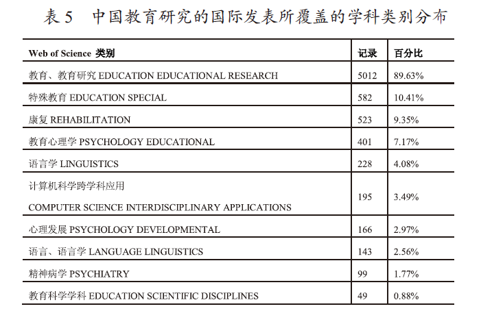 从表5可见,全球库中教育研究涵盖了康复学、教育心理学、语言学、计算机科学、精神病学、教育科学学科等多门交叉学科,说明中国教育研究中跨学科交叉研究的确占有相当的比例。