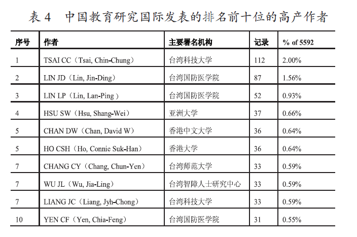 表4列入的10位高产作者均为港台学者,没有一位来自大陆地区的学术机构。他们其实来自港台地区的三个学术研究中心,都从事交叉学科研究。以台湾科技大学的TSAI CC为主,包括台湾师范大学的CHANG CY和台湾科技大学的LIANG JC在内的研究团队主要研究科学教育;台湾国防医学院的LIN JD、LIN LP、YEN CF和台湾智障人士研究中心的WU JL的研究领域是特殊教育、医学康复教育;香港中文大学的CHAN DW和香港大学的HO CSH主要从事教育心理学研究。