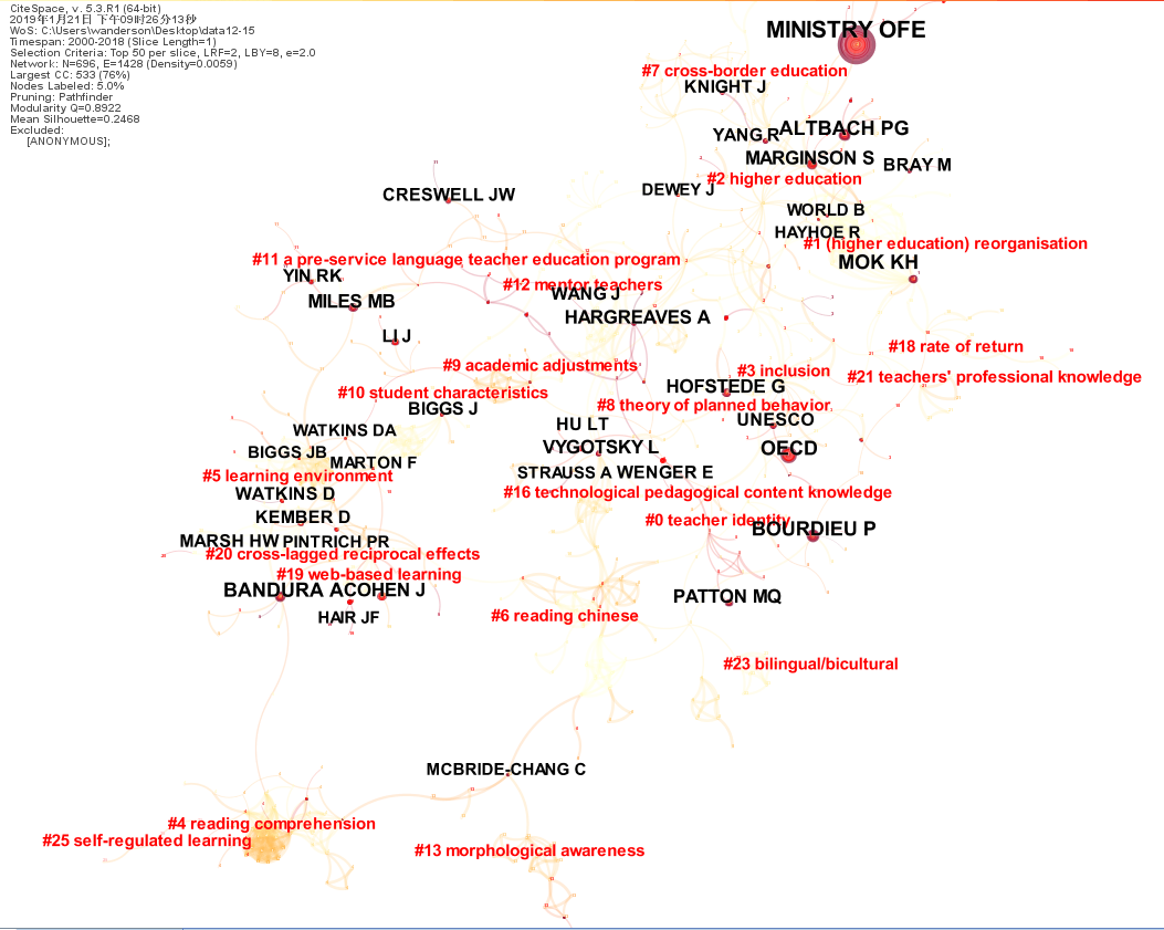 接着,我们使用Citespace作者共被引和文献共被引分析来了解国际中国教育研究的知识基础。作者共被引分析能揭示出研究领域内的奠基性学者及知识背景,而文献共被引分析则显示这一领域内产生了的关键文献的信息。