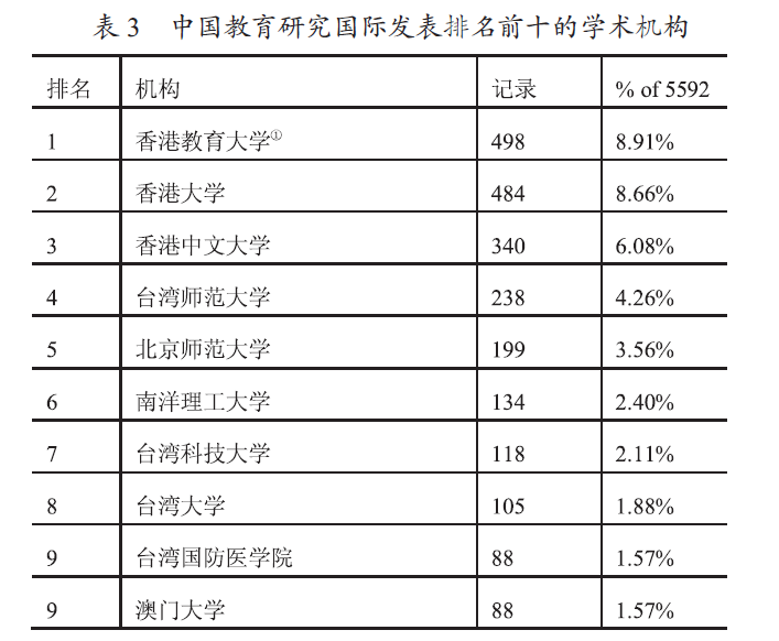 第二,大陆地区尚未形成具有国际影响力的学术中心。大陆学者与境外学者的国际合作发表多是“参与式”而非建构式的,并没有提出解释本土教育经验的原创性知识理论,在世界知识生产分工中处于的“学术加工”位置。